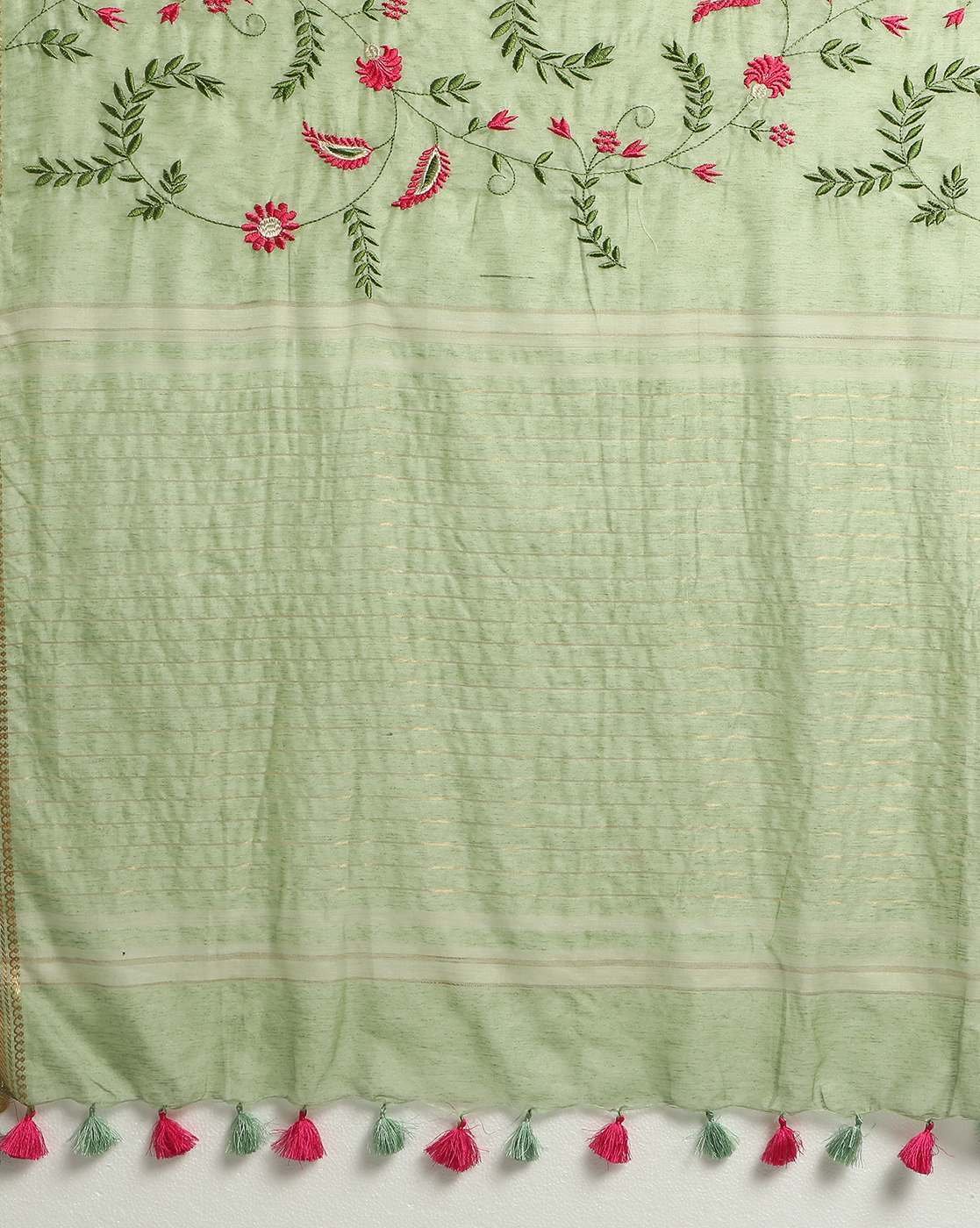 - Yellow linen silk saree has floral embroidered pattern, the pallu has tasseled hem